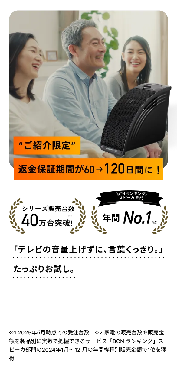 従来の良い音を求めてきたスピーカーとは異なり、言葉の「聞き取りやすさ」を追求した特許技術「曲面サウンド」搭載のスピーカーです。テレビの音量上げずに、言葉が聞こえやすくなるため、聞こえづらい方もそうでない方も、同じお部屋でストレスなく楽しめます。