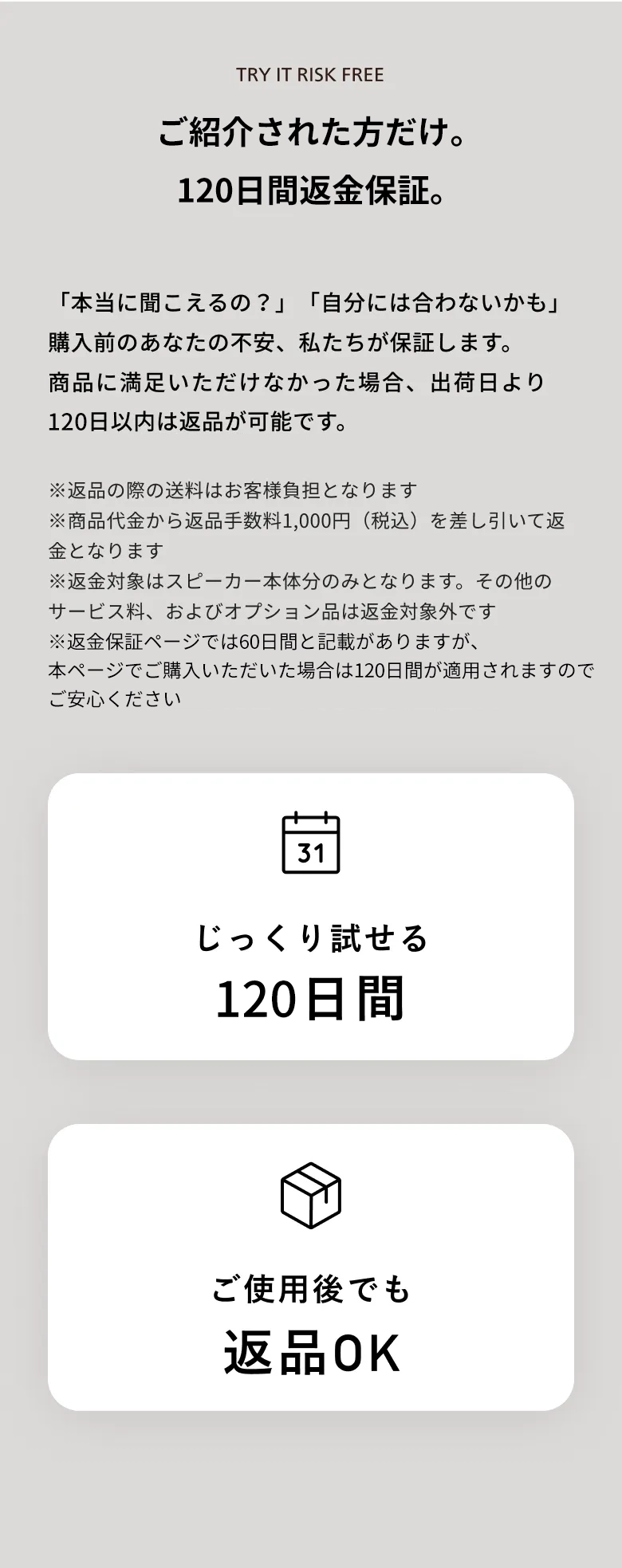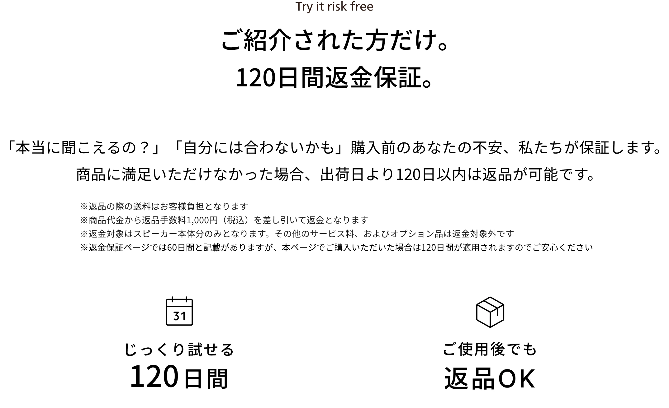 ※ 返金保証ページでは60日間と記載がありますが、本ページでご購入いただいた場合は120日間が適用されますのでご安心ください。