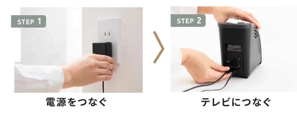 ミライスピーカーと電源をつなぐ、ミライスピーカーとテレビのイヤホンジャックをつなぐ、の2ステップで簡単に接続できる、カンタン接続はもちろんミライスピーカー・ミニも変わりません。