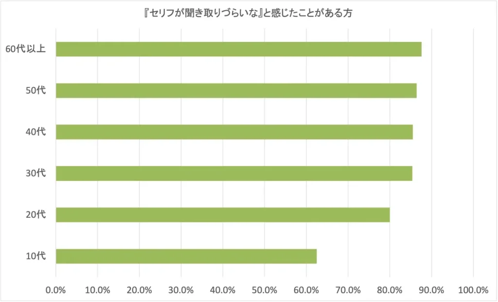 今回の調査結果から、テレビの「セリフの聞き取りづらさ」を感じている方は、全世代に多く存在していることがわかりました。