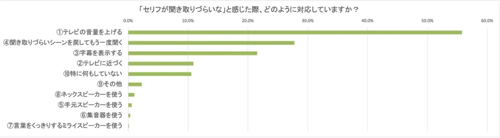 聞き取りづらい時にどのような対応をしているか、お聞きしたところ、圧倒的1位は「テレビの音量を上げる」であり、続いては「聞き取りづらいシーンを戻してもう一度聞く」「字幕を表示する」となります。