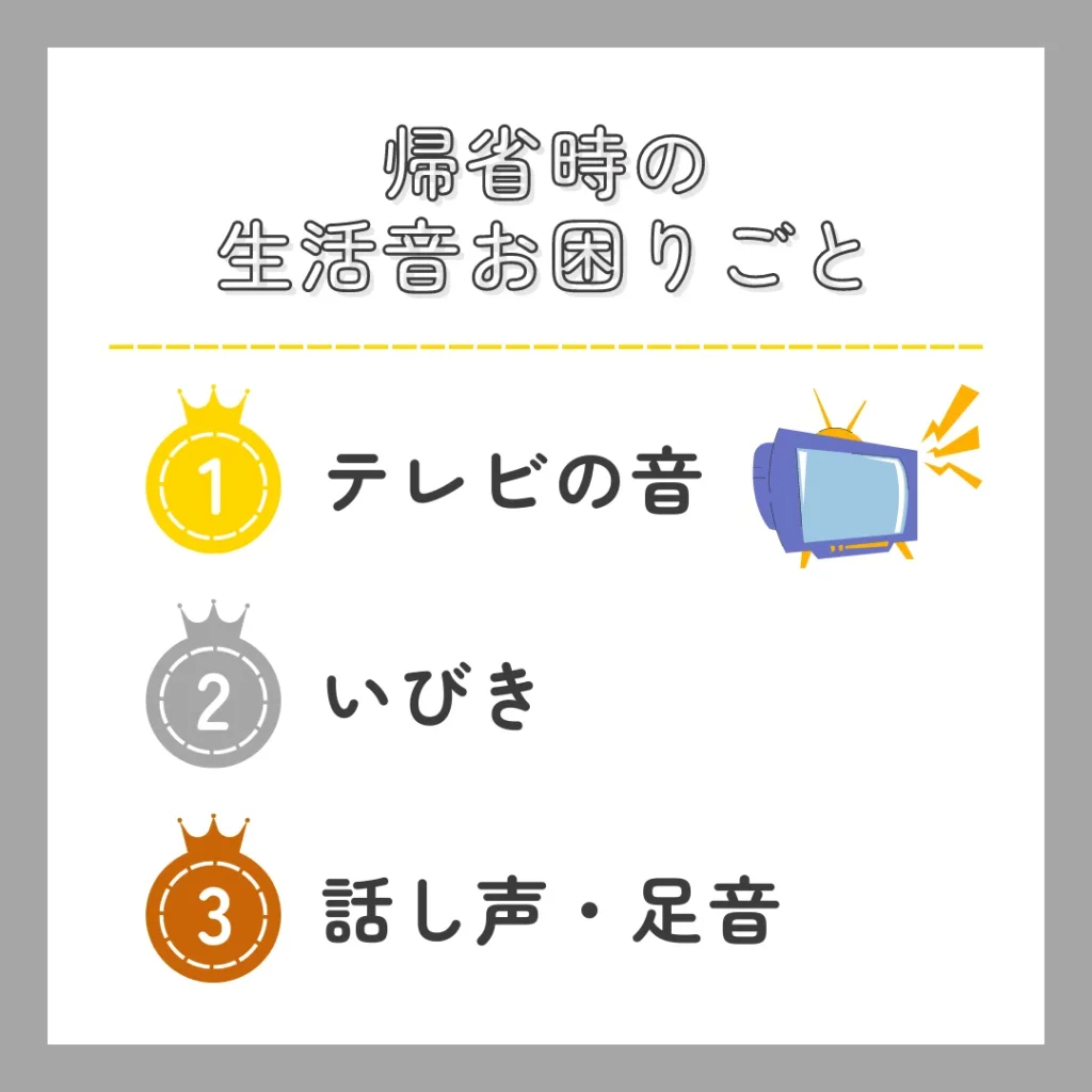 「帰省する」方に、帰省時の生活音で気になることを聞いたところ、最多回答が「テレビの音」に関すること、続いて「いびき」「足音」「話し声」となりました。