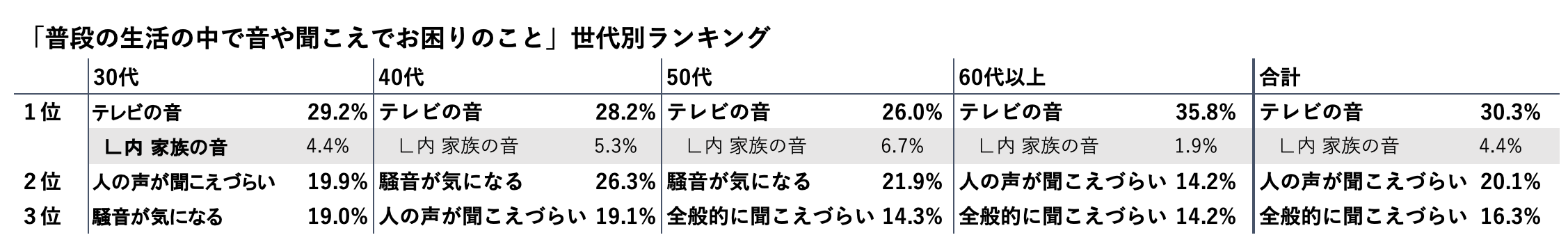30代以上の男女2,574名を調査、約半数が聞こえ/音の困りごとを回答その中で『テレビの音』が最多