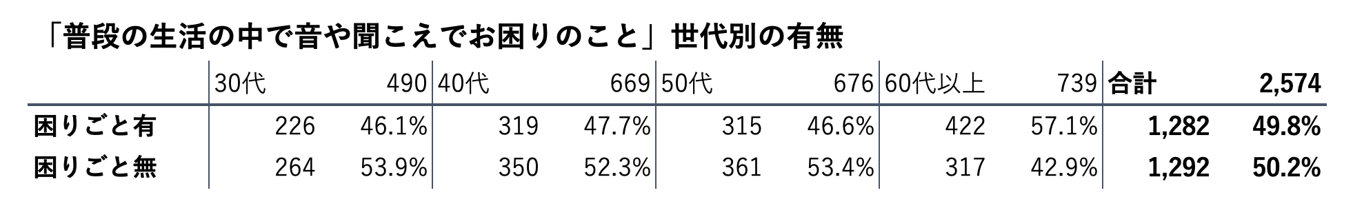 「Q. 普段の生活の中で音や聞こえでお困りのこと」をお聞きしたところ、全体の約半数の方がなんらかの困りごとが有ることを回答しました。特に、60代以上の方が多くなっていました。*