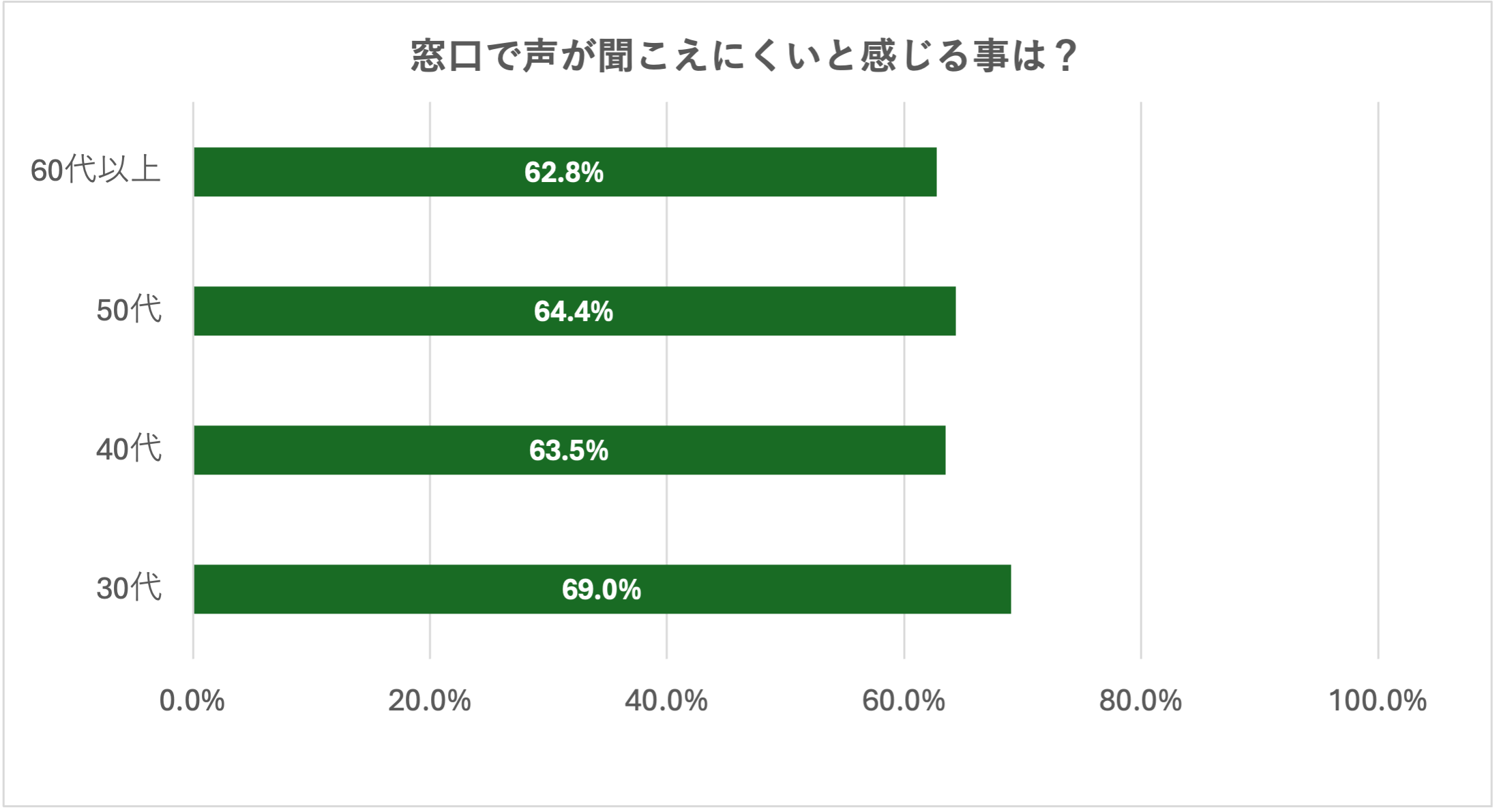 年代別に見ていくと、30代が最多で69.0%、40代以上は約62~64%となっていました。一般的には、年齢が高い方が、窓口での声の聞こえに課題をお持ちだと考えられますが、今回の調査の結果からは、その傾向は見られませんでした。