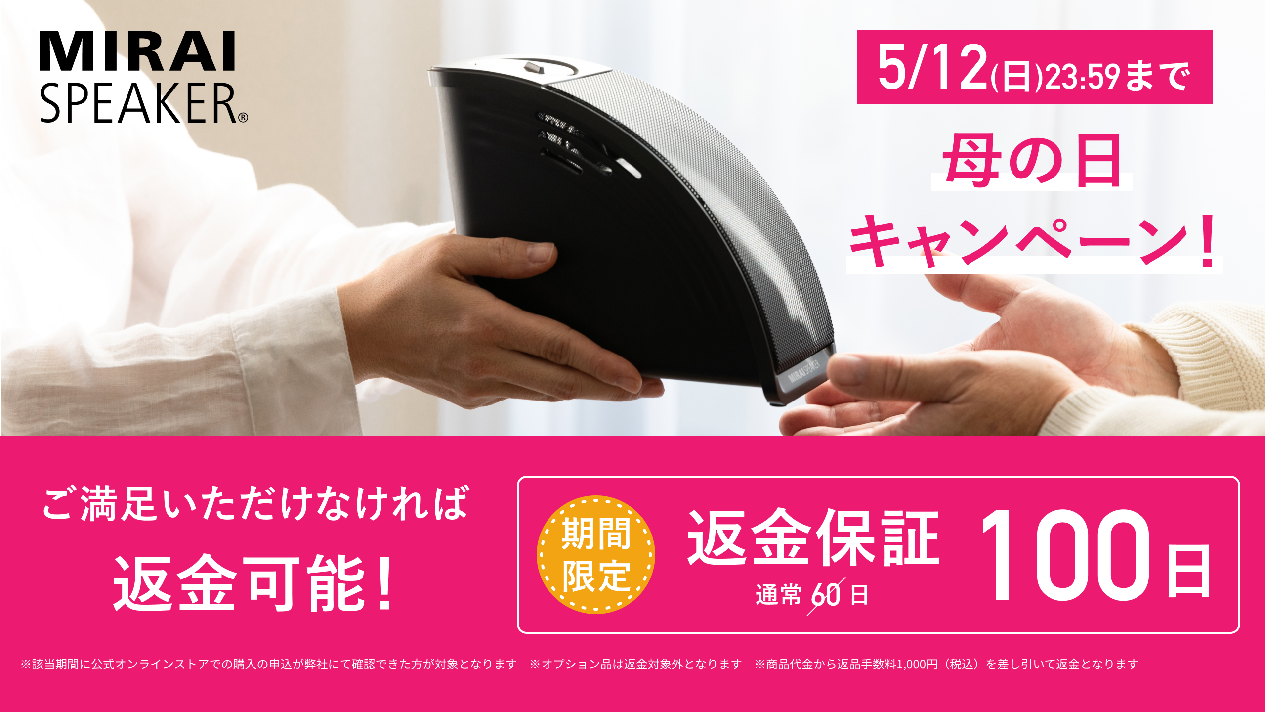 この度、母の日の贈り物をお探しの皆様に向けて、特別なキャンペーンを実施いたします。通常60日間の返金保証期間を、母の日にちなんで100日間に延長する「母の日キャンペーン」をご用意しました。テレビの音量にお困りの同居のご家族がいらっしゃる場合や、遠方にお住まいのご家族へのプレゼントとしても最適です。長期間ゆっくりお試しいただけるこの機会に、ぜひご利用ください。