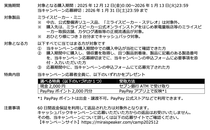 「100年の人生をテクノロジーで豊かにする」という想いのもと、テクノロジーの力で、誰もが明るく前向きに暮らせる社会づくりをめざす株式会社ミライスピーカーは(所在地:東京都中央区、代表取締役社長:山地浩、以下:「当社」)は、2025年12月12日(金)〜2026年1月13日(火)の期間中、「ミライスピーカー・ミニ」をご購入いただいたお客様を対象に、応募者全員に2,000円分の現金またはPayPayポイントをプレゼントする「キャッシュバックキャンペーン」を実施いたします。