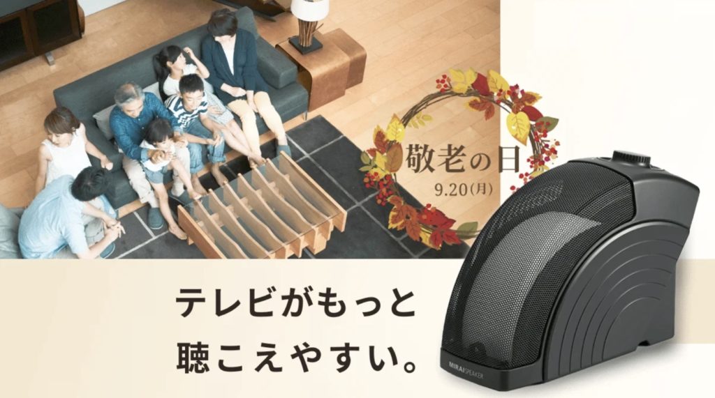 テレビの音を聴こえやすい音に変換するテクノロジー、世界初の特許技術『曲面サウンド』搭載の「ミライスピーカー・ホーム」の製造・販売を行う株式会社サウンドファン(所在地:東京都台東区、代表取締役社長:山地浩、以下:サウンドファン、以下「当社」)は、9月10日(金)〜9月27日(月)敬老の日キャンペーンを実施いたします。